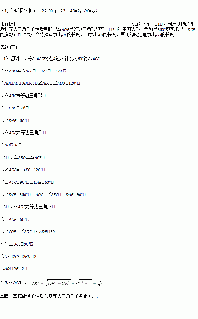 如图,在等边△ABC中,点D为△ABC内的一点,∠ADB=120°,∠ADC=90°,将△ABD绕点A逆时针旋转60°得△ACE,连接DE.