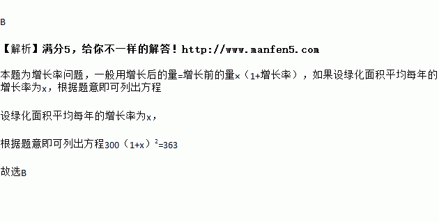某城市2014年底已有绿化面积300公顷,经过两年绿化,绿化面积逐年增加,到2016年底增加到363公顷,设绿化面积平均每年的增长率为x,由题意,所列方程正确的是( )
