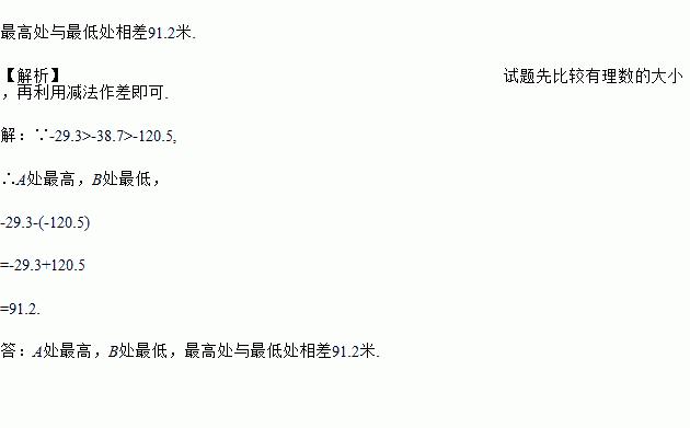 某矿井下有A、B、C三处的标高为A:-29.3米,B:-120.5米,C:-38.7米.哪处最高?哪处最低?最高处与最低处相差多少?