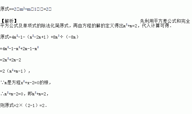 先化简,再求值:(2m+1)(2m﹣1)﹣(m﹣1)2+(2m)3÷(﹣8m),其中m是方程x2+x﹣2=0的根