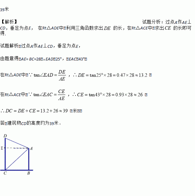 如图,小明的家在某住宅楼AB的最顶层(AB⊥BC),他家的后面有一建筑物CD(CD∥AB),他很想知道这座建筑物的高度,于是在自家阳台的A处测得建筑物CD的底部C的俯角是43°,顶部D的仰角是25°,他又测得两建筑物之间的距离BC是28米,请你帮助小明求出建筑物CD的高度(精确到1米).