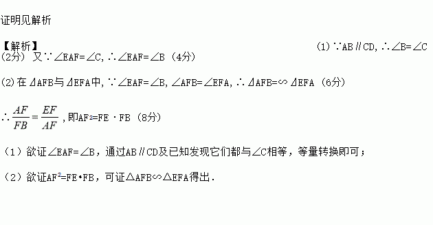 Ö¤Ã÷¼û½âÎö ¡¾½âÎö¡¿(1)¡ßAB¡ÎCD,¡à¡ÏB=¡ÏC (2·Ö) ÓÖ¡ß¡ÏEAF=¡ÏC,¡à¡ÏEAF=¡ÏB (4·Ö) (2)ÔÚ¨SAFBÓë¨SEFAÖÐ,¡ß¡ÏEAF=¡ÏB,¡ÏAFB=¡ÏEFA,¡à¨SAFB=¡×¨SEFA (6·Ö) ¡à,¼´AF2=FE¡¤FB (8·Ö) £¨1£©ÓûÖ¤¡ÏEAF=¡ÏB£¬Í¨¹ýAB¡ÎCD¼°ÒÑÖª·¢ÏÖËüÃǶ¼Óë¡ÏCÏàµÈ£¬µÈÁ¿×ª»»¼´¿É£» £¨2£©ÓûÖ¤AF2=FE•FB£¬¿ÉÖ¤¡÷...