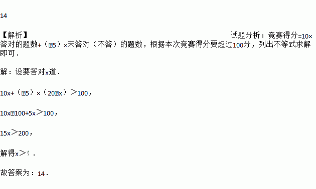 我国从2011年5月1日起在公众场所实行“禁烟”,为配合“禁烟”行动,某校组织开展了“吸烟有害健康”的知识竞赛,共有20道题.答对一题记10分,答错(或不答)一题记﹣5分.小明参加本次竞赛得分要超过100分,他至少要答对 道题.