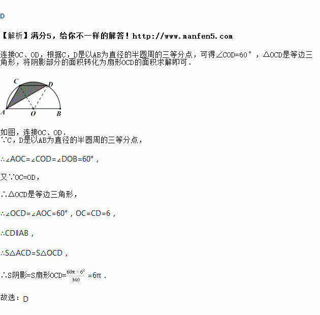 如图,,是以为直径的半圆周的三等分点,,则阴影部分的面积是( )