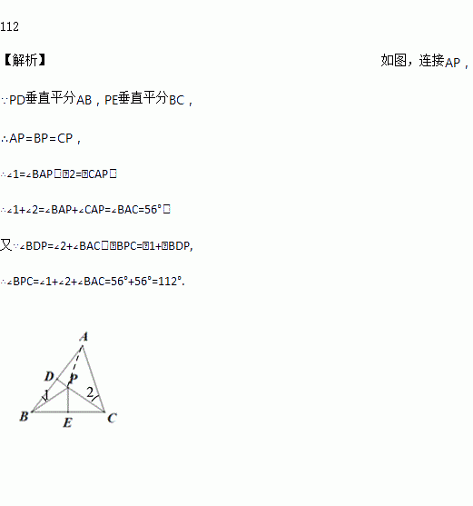 如图,△ABC中,∠BAC=56°,PD垂直平分AB,PE垂直平分BC,则∠BPC=______°