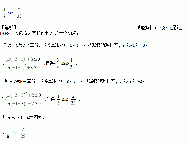 如图,抛物线y=ax2+bx+c与x轴的一个交点A在点(-2,0)和(1,0)之间(包括这两点),顶点C是矩形DEFG上(包括边界和内部)的一个动点,则a的取值范围是________.
