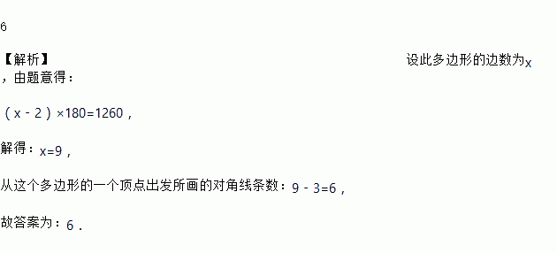 6 【解析】设此多边形的边数为x,由题意得: (x﹣2)×180=1260, 解得:x=9, 从这个多边形的一个顶点出发所画的对角线条数:9﹣3=6, 故答案为:6.