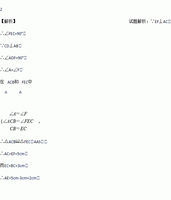 如图,△ABC中,∠ACB=90,BC=3cm,CD⊥AB于D,在AC上取一点E,使EC=BC,过点E作EF⊥AC交CD的延长线于点F,若EF=5cm,则AE=______cm.