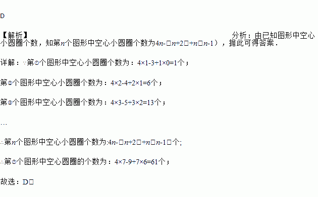 下列图形都是由同样大小的小圆圈按一定规律组成的,其中第①个图形中一共有1个 空 心小圆圈,第②个图形中一共有6个空心 小圆圈,第③个图形中一共有13个空 心 小圆圈,…, 按此规律排列,则第⑦个图形中空心小圆圈的个数为( )