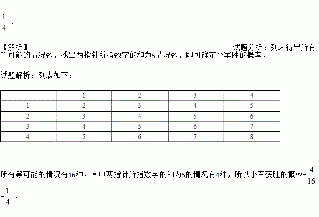 小明和小军两人一起做游戏,游戏规则如下:每人从1,2,…,8中任意选择一个数字,然后两人各转动一次如图所示的转盘(转盘被分为面积相等的四个扇形),两人转出的数字之和等于谁事先选择的数,谁就获胜;若两人转出的数字之和不等于他们各自选择的数,就在做一次上述游戏,直至决出胜负.若小军事先选择的数是5,用列表或画树状图的方法求他获胜的概率.
