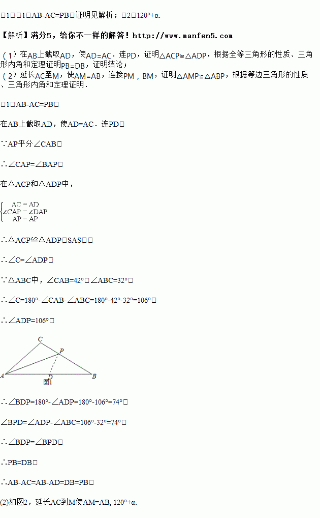 (1)如图,若α=21°,∠ABC=32°,且AP交BC于点P,试探究线段AB、AC与PB之间的数量关系,并对你的结论加以证明;