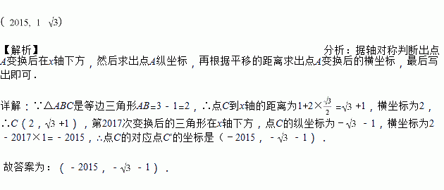 如图,等边三角形ABC的顶点A、B坐标分别为(1,1)、(3,1),若把等边△ABC先沿x轴翻折,再向左平移1个单位”为第一次変换,则这样连续经过2017次变换后,等边△ABC的顶点C的坐标为_________.