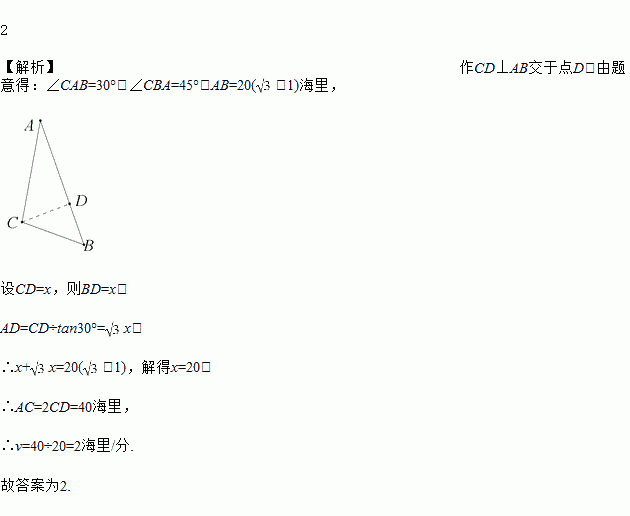 +1)海里,渔船将险情报告给位于A处的救援船后,沿北偏西65°方向向海岛C靠近,同时,从A处出发的救援船沿南偏西10°方向匀速航行,20分钟后,救援船在海岛C处恰好追上渔船,那么救援船航行的速度为________海里/分.