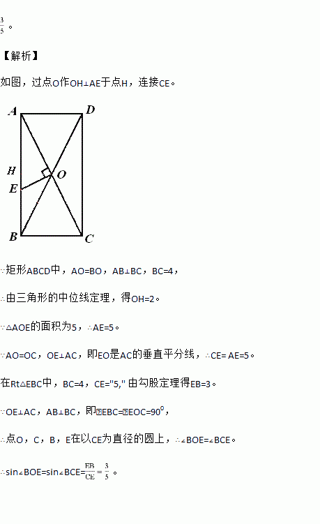 如图。矩形ABCD的对角线AC、BD相交于点O,过点O作OE⊥AC交AB于E,若BC=4,△AOE的面积为5,则sin∠BOE的值为 .