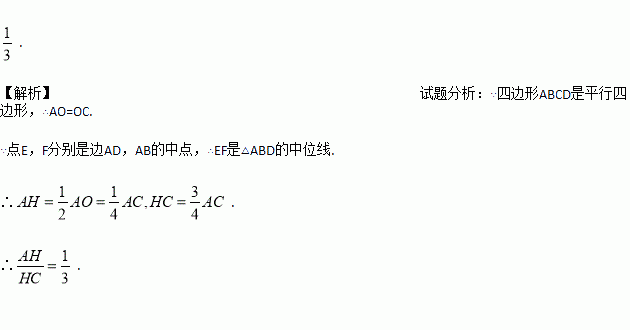如图,在平行四边形ABCD中,对角线AC,BD相交于点O,点E,F分别是边AD,AB的中点,EF交AC于点H,则的值为 .