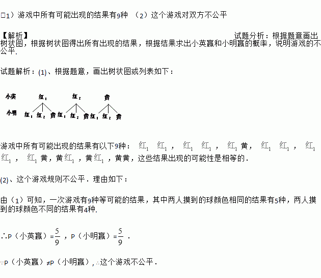 (1)游戏中所有可能出现的结果有9种 (2)这个游戏对双方不公平 【解析】试题分析:根据题意画出树状图,根据树状图得出所有出现的结果,根据结果求出小英赢和小明赢的概率,说明游戏的不公平. 试题解析:(1)、根据题意,画出树状图或列表如下: 游戏中所有可能出现的结果有以下9种: , , 黄, , , 黄,黄,黄,黄黄,这些结果出现的可能性是相等的. (2)、这个游戏规则不公平...