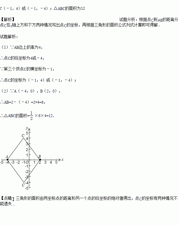已知三角形ABC的两个顶点坐标为A(﹣4,0),B(2,0),如图,且过这两个点的边上的高为4,第三个顶点的横坐标为﹣1,求顶点C的坐标及三角形的面积.