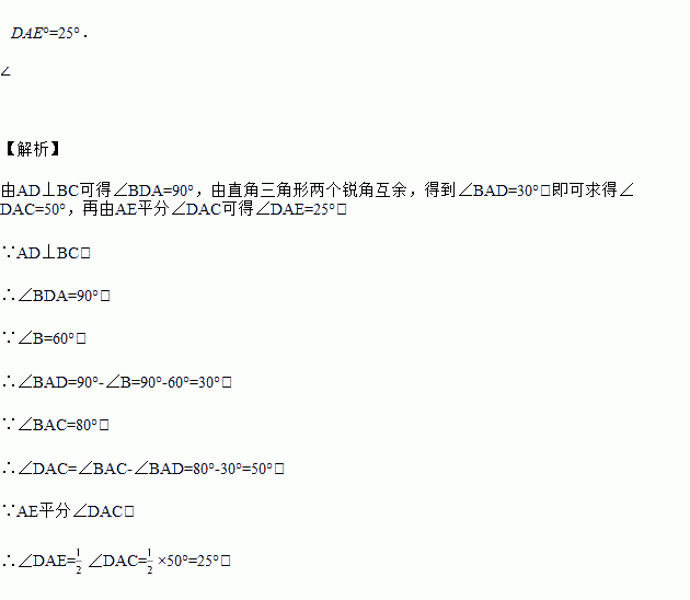 已知,如图,在△ABC,∠BAC=80°,AD⊥BC于D,AE平分∠DAC,∠B=60°,求∠DAE的度数.