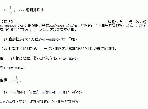 (1);(2)证明见解析. 【解析】试题分析:一元二次方程ax2+bx+c=0(a≠0)的根的判别式△=b2﹣4ac:当△>0,方程有两个不相等的实数根;当△=0,方程有两个相等的实数根;当△<0,方程没有实数根. (1)直接把x=1代入方程x2+mx+m﹣2=0求出m的值; (2)计算出根的判别式,进一步利用配方法和非负数的性质证得结论即可. 【解析】 (1)根据题意,...