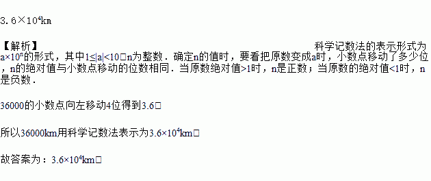 北京时间6月5日21时07分,中国成功将风云二号H气象卫星送入预定的高度36000km的地球同步轨道,将36000km用科学记数法表示为_____.