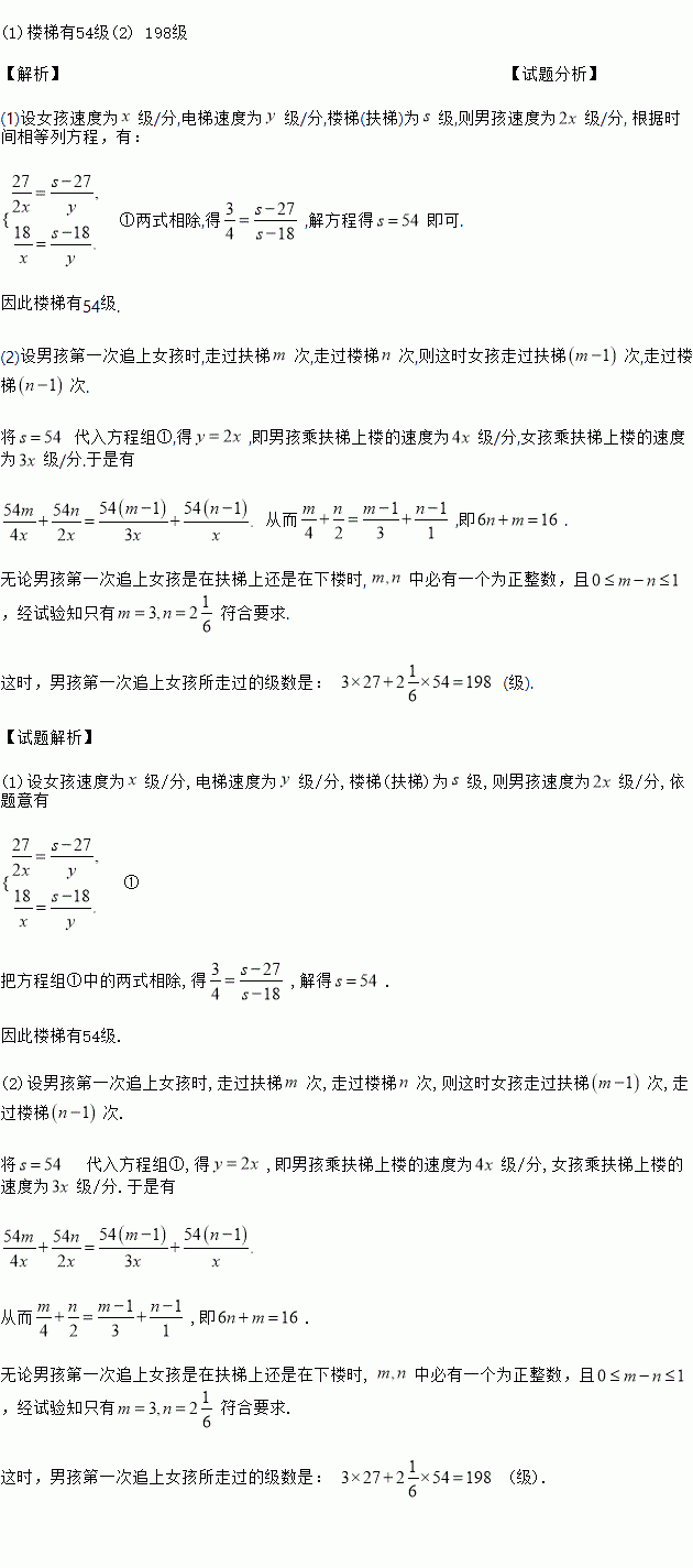 (2)如果扶梯附近有一从二楼下到一楼的楼梯,台阶级数与扶梯级数相等,这两人各自到扶梯顶部后按原速度走下楼梯,到一楼后再乘坐扶梯(不考虑扶梯与楼梯间的距离).则男孩第一次追上女孩时,他走了多少台阶?
