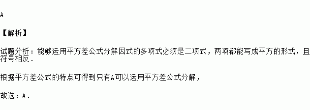 A 【解析】 试题分析:能够运用平方差公式分解因式的多项式必须是二项式,两项都能写成平方的形式,且符号相反. 根据平方差公式的特点可得到只有A可以运用平方差公式分解, 故选:A.