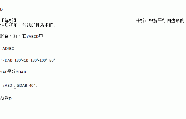 如图,□ABCD中,AE平分∠DAB,∠B=100°,则∠AED的度数为