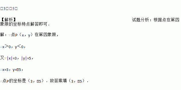 已知点P(x,y)在第四象限,且|x|=3,|y|=5,则点P的坐标是______。