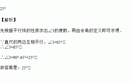 如图,将三角板的直角顶点放在直尺的一边上,若∠1=65°,则∠2的度数为____.