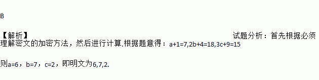 B 【解析】试题分析:首先根据必须理解密文的加密方法,然后进行计算.根据题意得:a+1=7,2b+4=18,3c+9=15 则a=6,b=7,c=2,即明文为6,7,2.