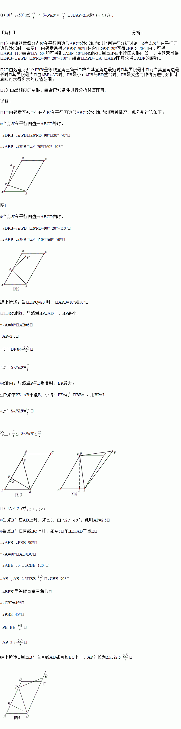 Èçͼ1£¬ÔÚÆ½ÐÐËıßÐÎABCDÖУ¬AB£½5£¬AD£½8£¬¡ÏA£½60¡ã£¬µãPΪAD±ßÉÏÈÎÒâÒ»µã£¬Á¬½ÓPB£¬²¢½«PBÈÆµãPÄæÊ±ÕëÐýת90¡ãµÃµ½Ïß¶ÎPB¡ä£®