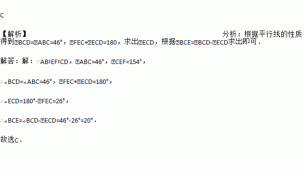 如图,AB∥EF∥CD,∠ABC=46°,∠CEF=154°,则∠BCE等于( )