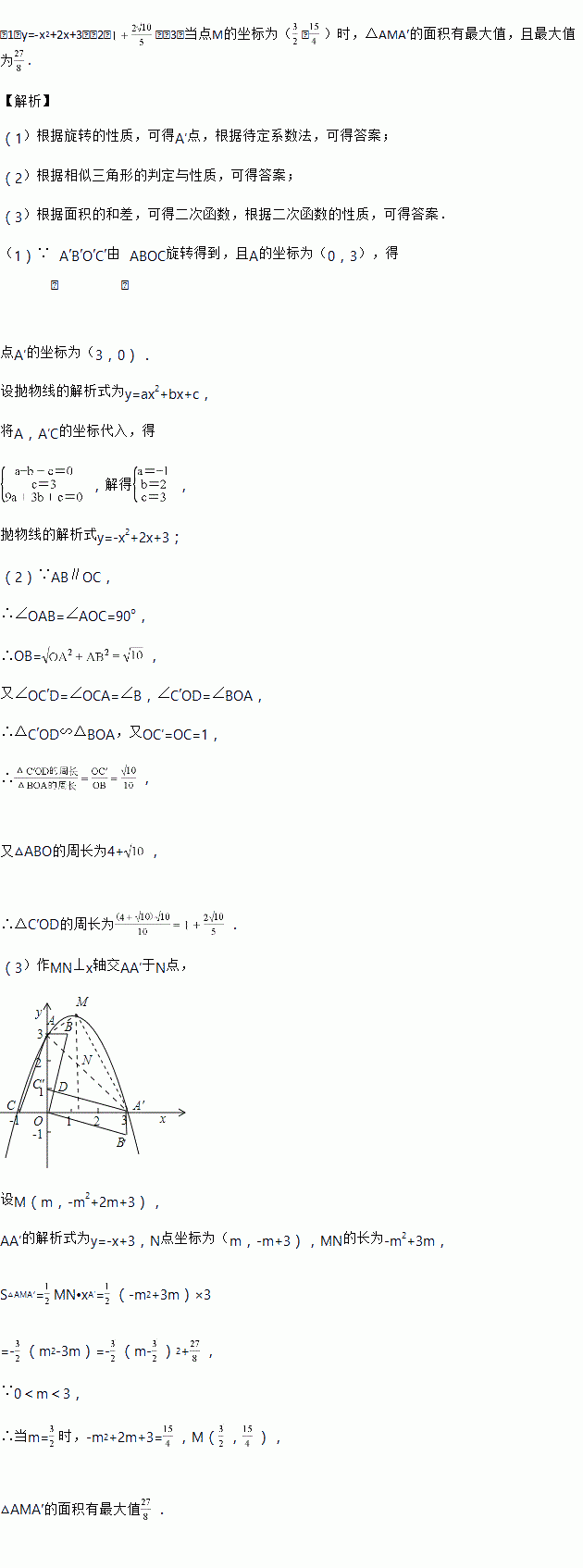 (3)点M是第一象限内抛物线上的一动点,问:点M在何处时;△AMA′的面积最大?最大面积是多少?并求出此时点M的坐标.