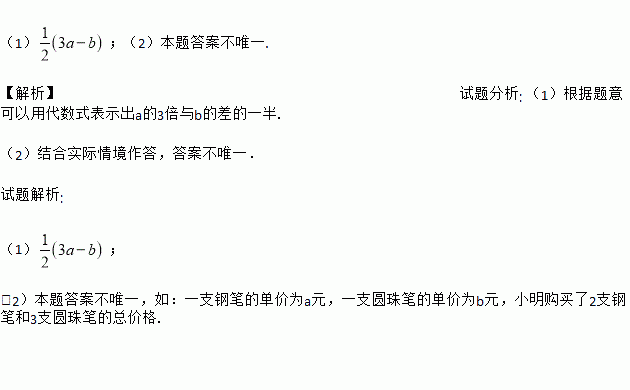 (1);(2)本题答案不唯一. 【解析】试题分析: (1)根据题意可以用代数式表示出a的3倍与b的差的一半. (2)结合实际情境作答,答案不唯一. 试题解析: (1); (2)本题答案不唯一,如:一支钢笔的单价为a元,一支圆珠笔的单价为b元,小明购买了2支钢笔和3支圆珠笔的总价格.解方程: ![]()