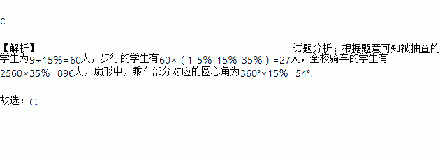 某校对学生上学方式进行了一次抽样调查,如下图是根据此次调查结果所绘制的扇形图形,已知该学校2560人,被调查的学生中乘车的有9人,则下列四种说法中,不正确的是( )