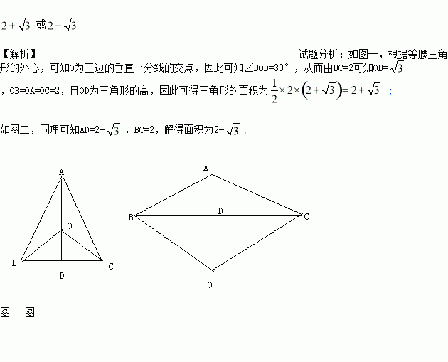 若点O是等腰△ABC的外心,且∠BOC=60°,底边BC=2,则△ABC的面积为_________________.