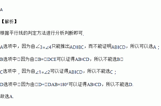 A. ∠3=∠4. B. ∠B=∠DCE.