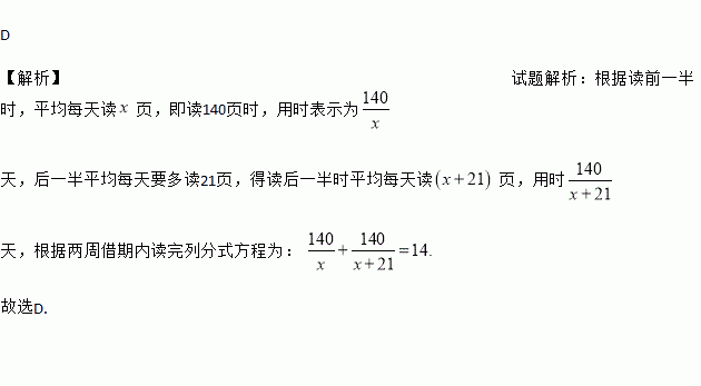 文文借了一本书共280页,要在两周借期内读完.当她读了一半时,发现平均每天要多读21页才能在借期内读完.她在读前一半时,平均每天读多少页?如果设读前一半时,平均每天读