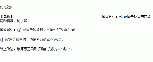 等腰三角形的一个内角为80°,则顶角的度数是_________.