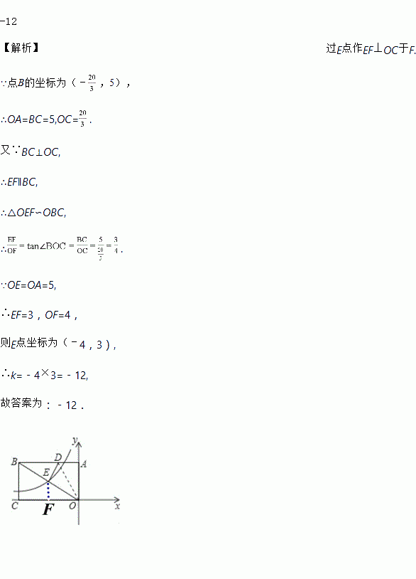 如图,矩形AOCB的两边OC、OA分别位于x轴、y轴上,点B的坐标为(﹣,5),D是AB边上一点,将△ADO沿直线OD翻折,使点A恰好落在对角线OB上的E点处,若E点在反比例函数y=的图象上,则k=_____.