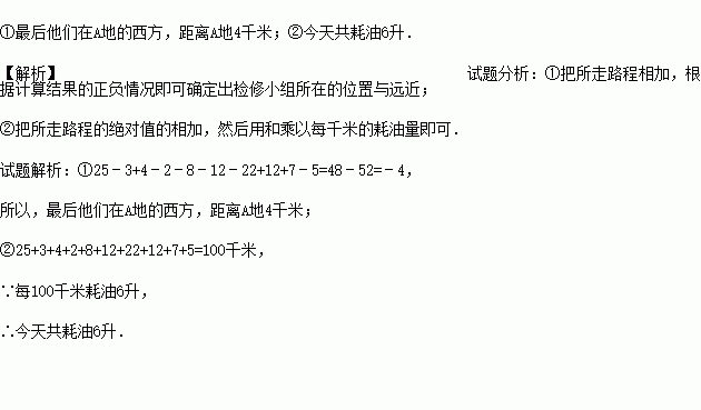 某检修小组乘汽车检修公路道路.向东记为正.某天自A地出发.所走路程(千米)为:25,﹣3,4,﹣2,﹣8,﹣12,﹣22,12,7,﹣5;问:①最后他们在A地的什么地方?距离A地多远?②若每100千米耗油6升,则今天共耗油多少升?