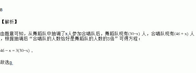 为了参加全校文艺演出,某年级组建了46人的合唱队和30人的舞蹈队,现根据演出需要,从舞蹈队中抽调了部分同学参加合唱队,使合唱队的人数恰好是舞蹈队的人数的3倍.设从舞蹈队中抽调了x人参加合唱队,可得正确的方程是( )