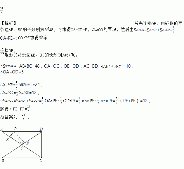 如图,点P是矩形ABCD的边AD上的一个动点,矩形的两条边长AB、BC分别为6和8,对角线AC、BD相交于点O.则点P到矩形的两条对角线AC和BD的距离之和为_____.