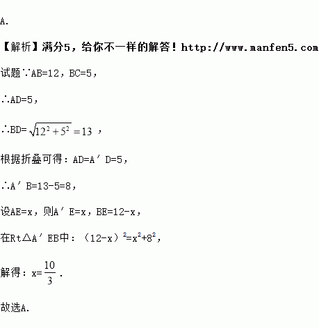 如图,在矩形纸片ABCD中,AB=12,BC=5,点E在AB上,将△DAE沿DE折叠,使点A落在对角线BD上的点A′处,则AE的长为( )