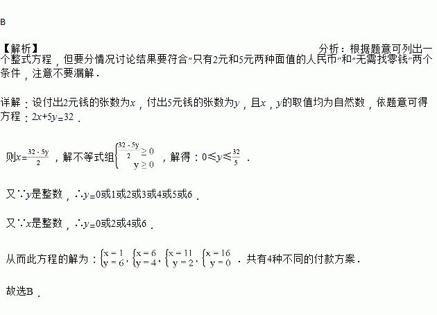 小明购买文具一共要付32元,小明钱包里只有2元和5元两种面值若干张钱,他一共有几种不同的付款方案( )