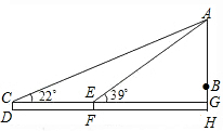 极具特色的“八卦楼”(又称“威镇阁”)是漳州的标志性建筑,它建立在一座平台上.为了测量“八卦楼”的高度AB,小华在D处用高1.1米的测角仪CD,测得楼的顶端A的仰角为22°;再向前走63米到达F处,又测得楼的顶端A的仰角为39°(如图是他设计的平面示意图).已知平台的高度BH约为13米,请你求出“八卦楼”的高度约多少米?