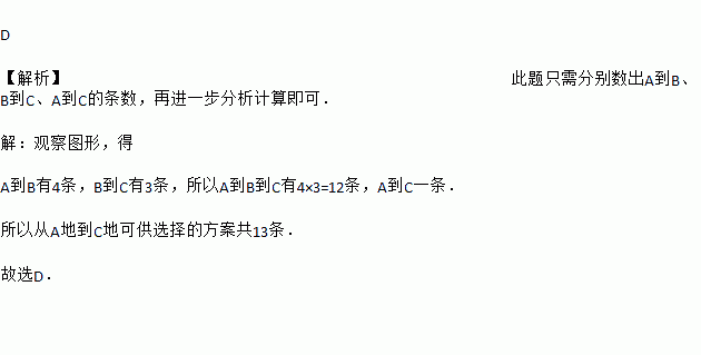如图,从A地到C地,可供选择的方案是走水路、走陆路、走空中,从A地到B地有两条水路、两条陆路,从B地到C地有3条陆路可供选择,走空中,从A地不经B地直线到C地,则从A地到C地可供选择的方案有( )