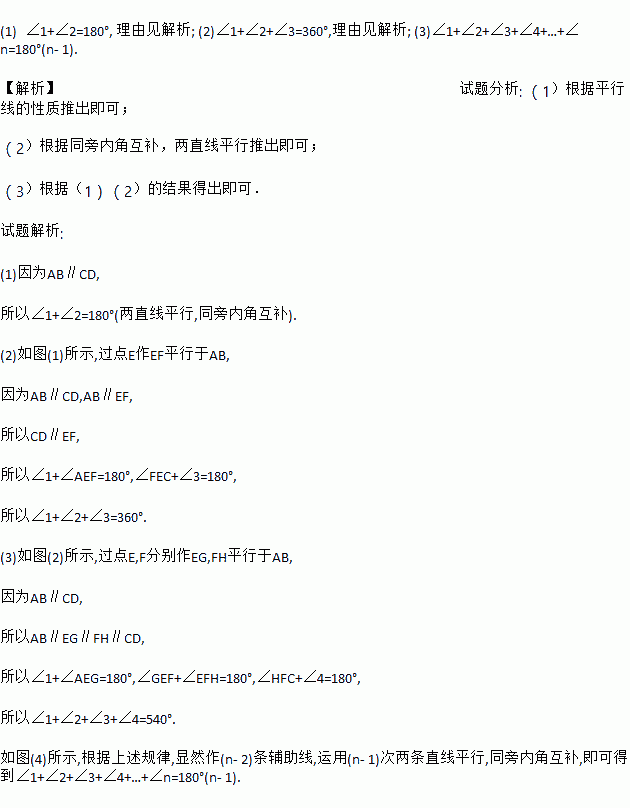 (1) ∠1+∠2=180°, 理由见解析; (2)∠1+∠2+∠3=360°,理由见解析; (3)∠1+∠2+∠3+∠4+…+∠n=180°(n- 1). 【解析】试题分析: (1)根据平行线的性质推出即可; (2)根据同旁内角互补,两直线平行推出即可; (3)根据(1)(2)的结果得出即可. 试题解析: (1)因为AB∥CD, 所以∠1+∠2=180°(两直...