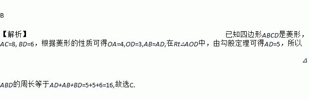 B 【解析】已知四边形ABCD是菱形,AC=8, BD=6,根据菱形的性质可得OA=4,OD=3,AB=AD,在Rt△AOD中,由勾股定理可得AD=5,所以△ABD的周长等于AD+AB+BD=5+5+6=16,故选C.