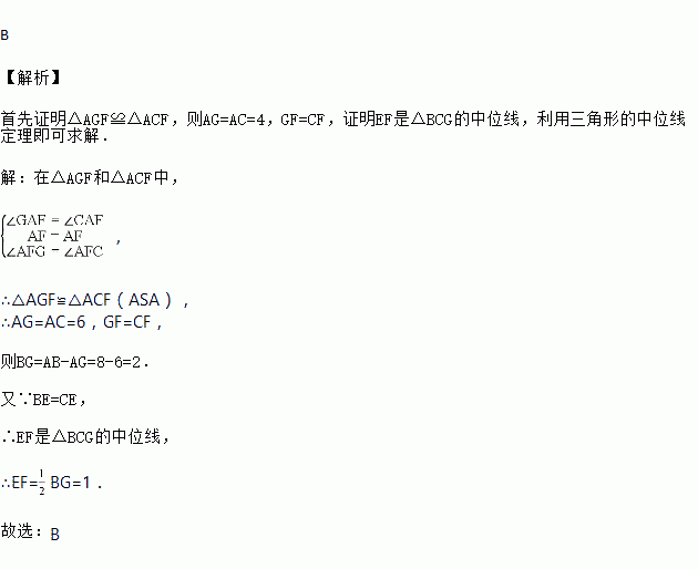 如图,△ABC中,AB=8,AC=6,AD,AE分别是其角平分线和中线,过点C作 CG⊥AD 于点F,交AB于点G,连接EF,则线段EF 的长为( )